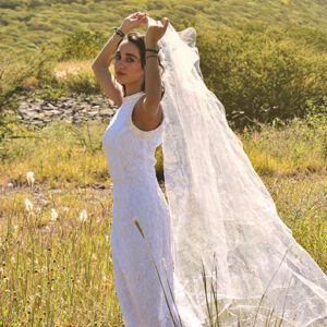 El vestido blanco y el velo contrastan con el entorno natural, creando una atmósfera de ensueño y libertad.