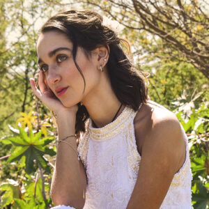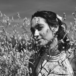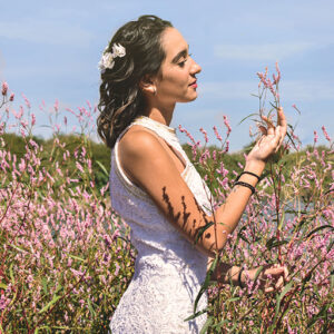 Lleva un vestido de encaje y una flor en el pelo, creando una atmósfera de calma y belleza natural.