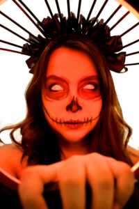 la iluminación resalta su expresión enigmática, creando una atmósfera perfecta para Halloween: misteriosa, teatral y cautivadora es lo que resalta la fotografía.
