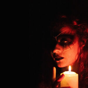 Retrato iluminado solo por la cálida luz de una vela, que revela parcialmente su rostro oscuro y trazos misteriosos evocando el poder y el misterio del Halloween.