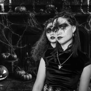 maquillaje y vestimenta oscura, se miran con complicidad. El fondo resalta sus atuendos creando un contraste visual.