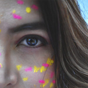 Retrato con maquillaje oscuro creando una sensación de movimiento y energía, como si lanzara un conjuro.